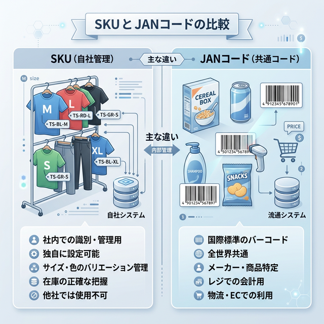 SKUは自社独自の管理単位を指します。 一方、JANコードはその商品を世界中で一意に識別するための共通バーコード番号であり、物流や小売の標準として機能します。