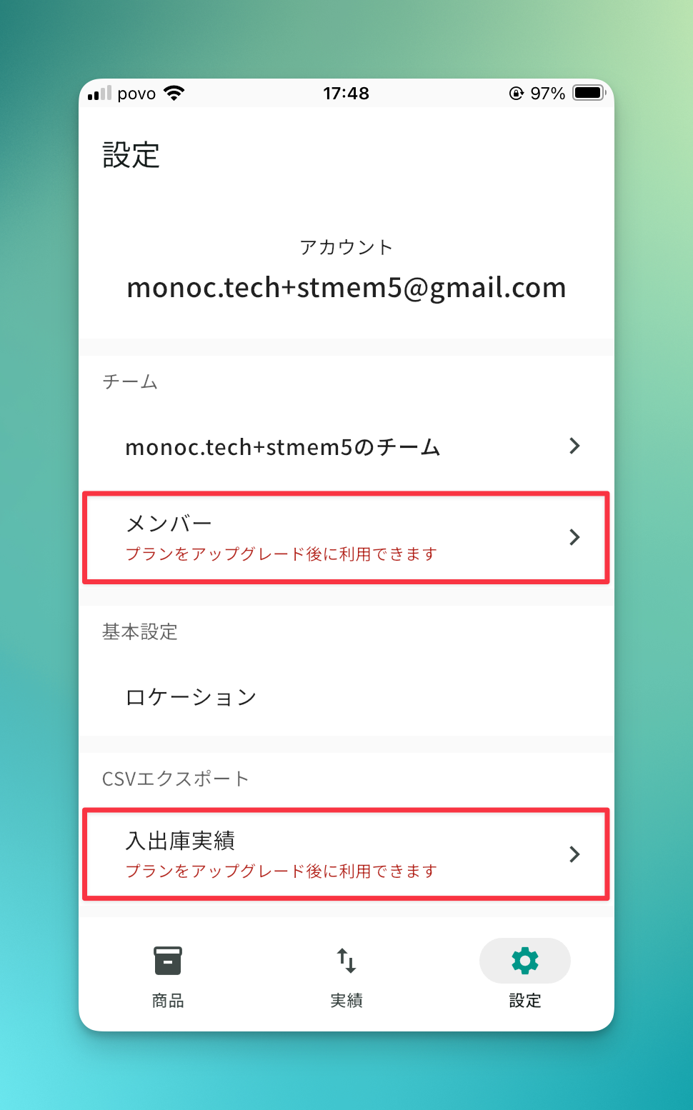 - 「メンバー」または「入出庫実績」など、アップグレードが必要な機能の行 をタップします。