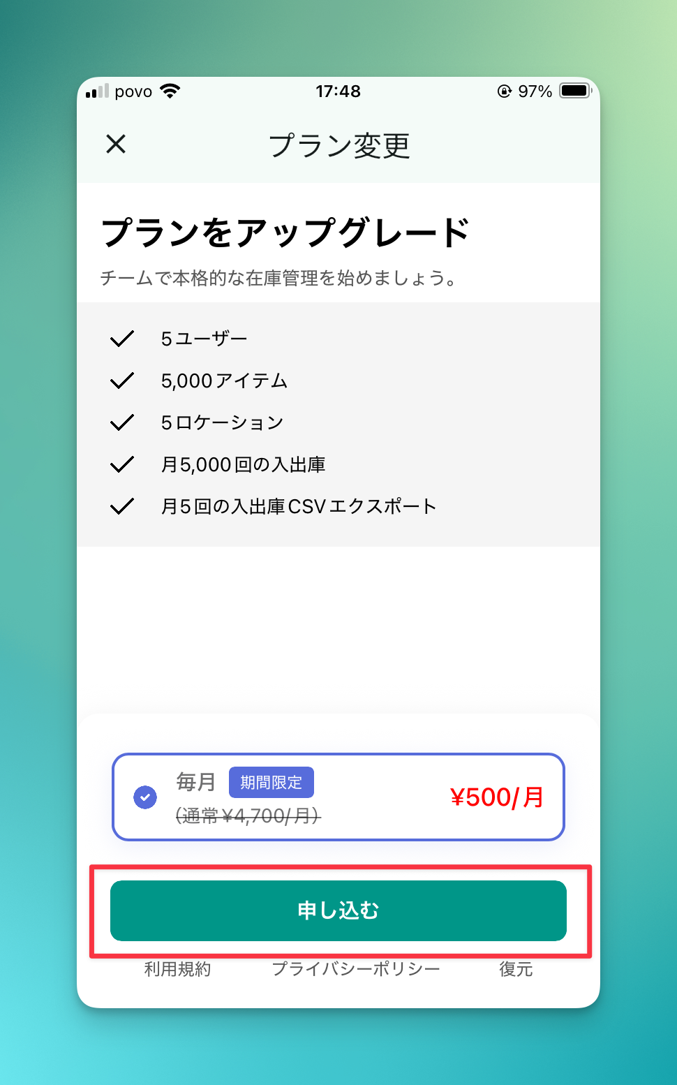 - 選択内容に間違いがなければ、「申し込む」ボタン をタップします。